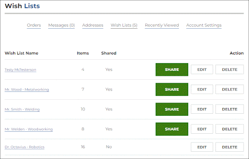 In the Wish Lists window, you’ll be able to view all your saved Wish Lists and edit them to change their name or make them shareable.